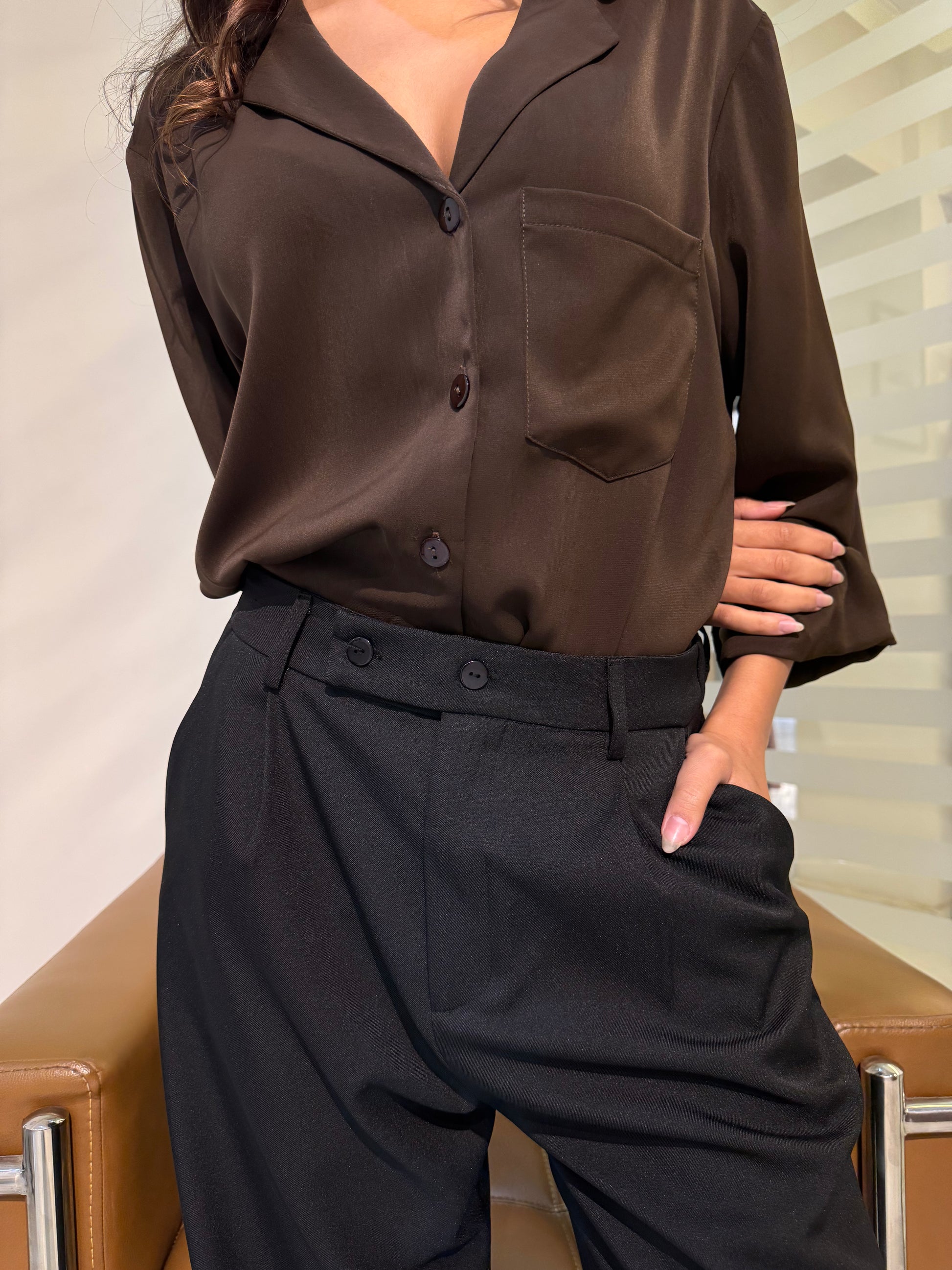 A timeless button-up shirt designed with a relaxed silhouette and clean tailored lines. Featuring a soft collar, front button closure, and a minimal chest pocket detail, this piece offers effortless elegance for everyday formal styling. Perfect for pairing with tailored trousers or layering under structured blazers for a polished finish.