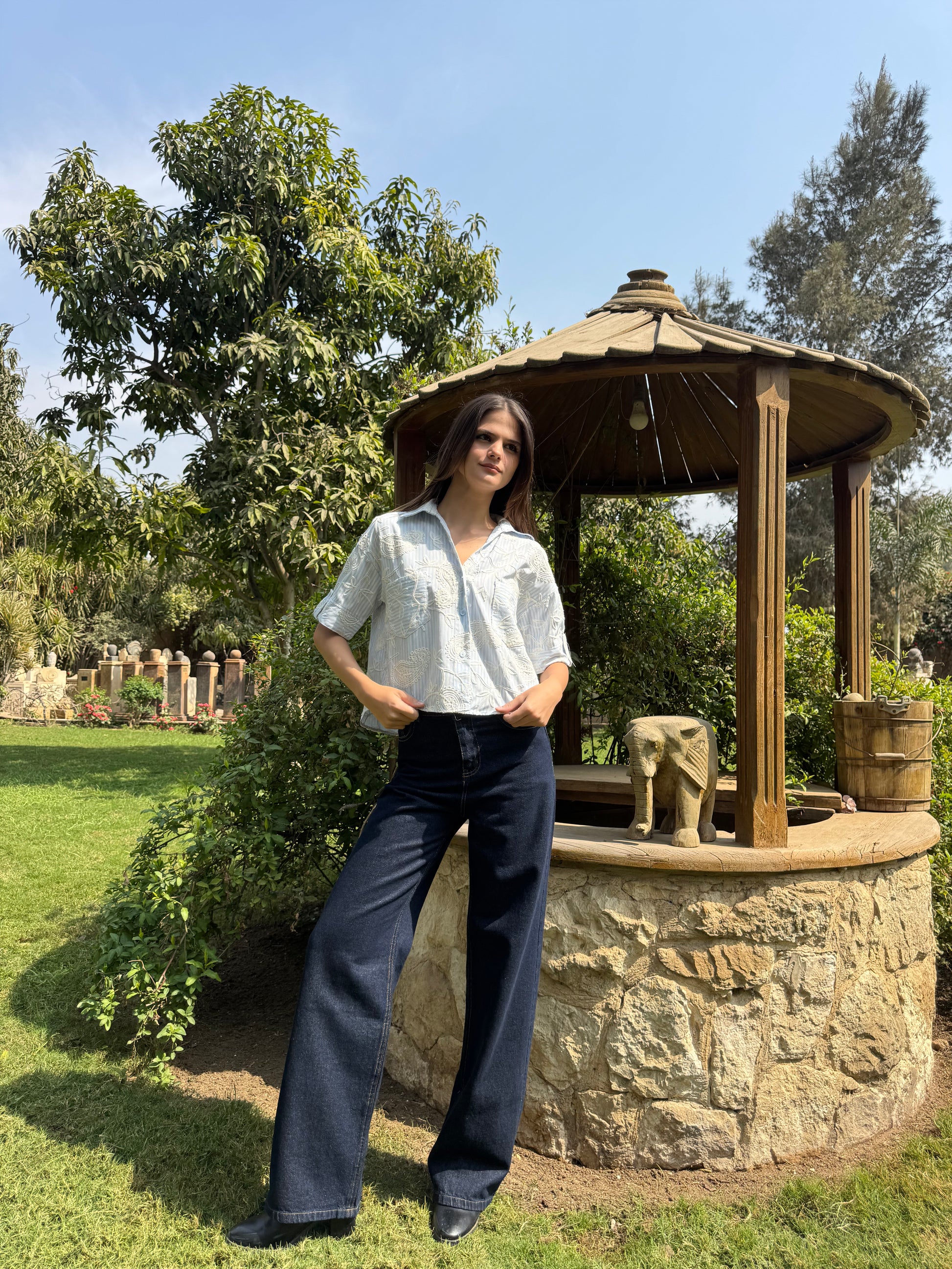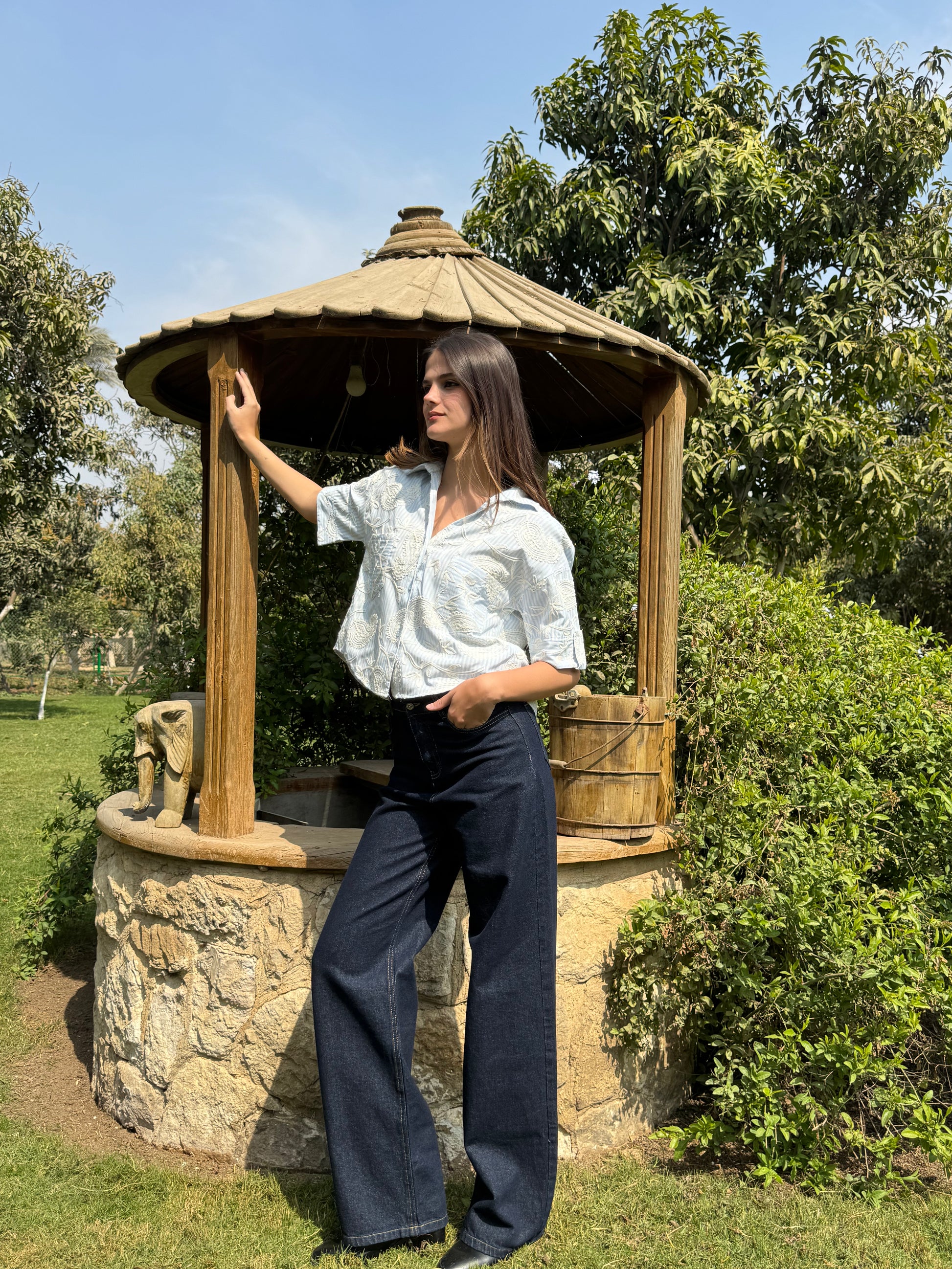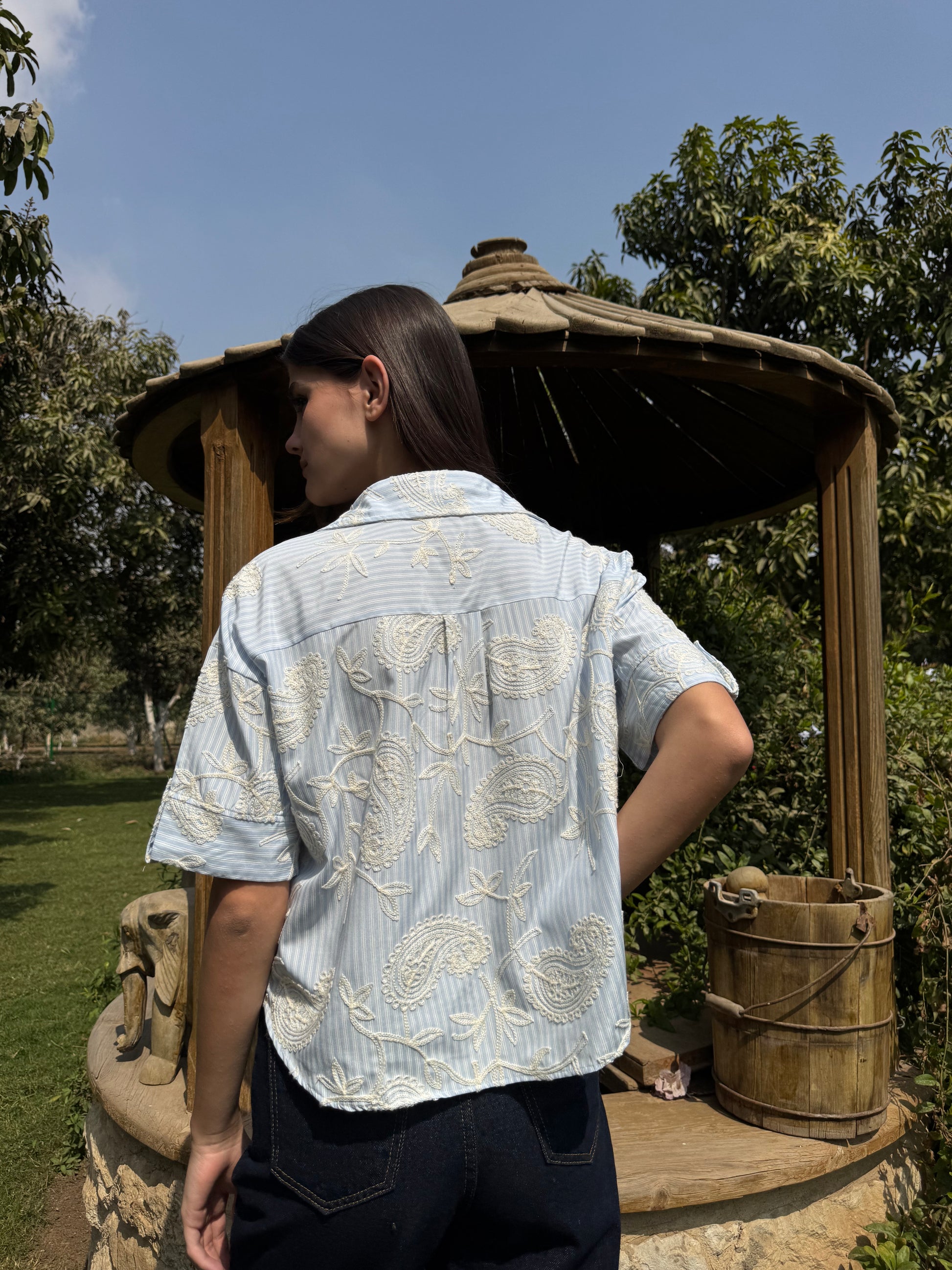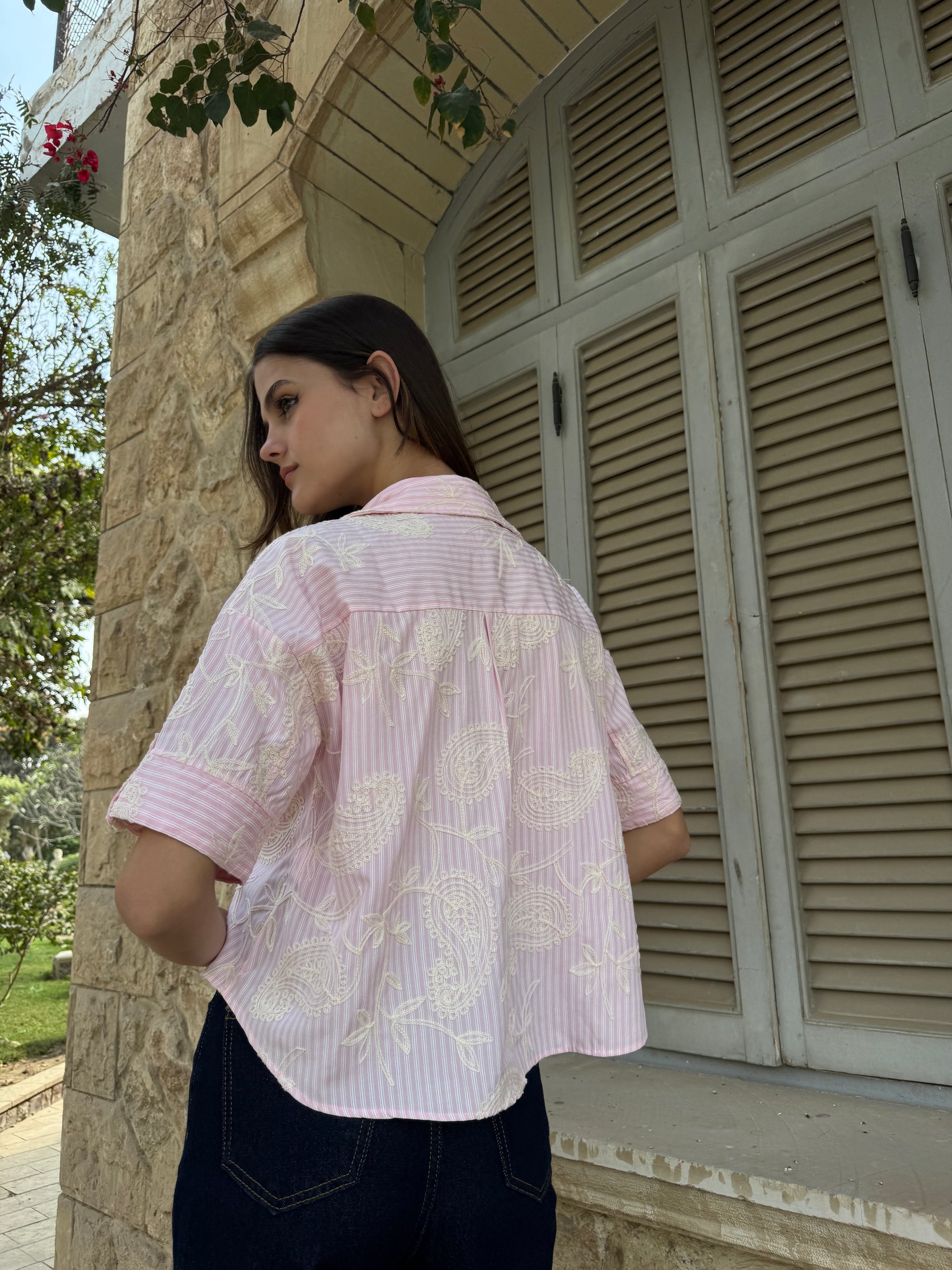 A stylish shirt featuring a unique blend of classic stripes and elegant paisley embroidery. Designed with a relaxed silhouette and statement pockets, it offers a chic and modern look perfect for effortless everyday styling.